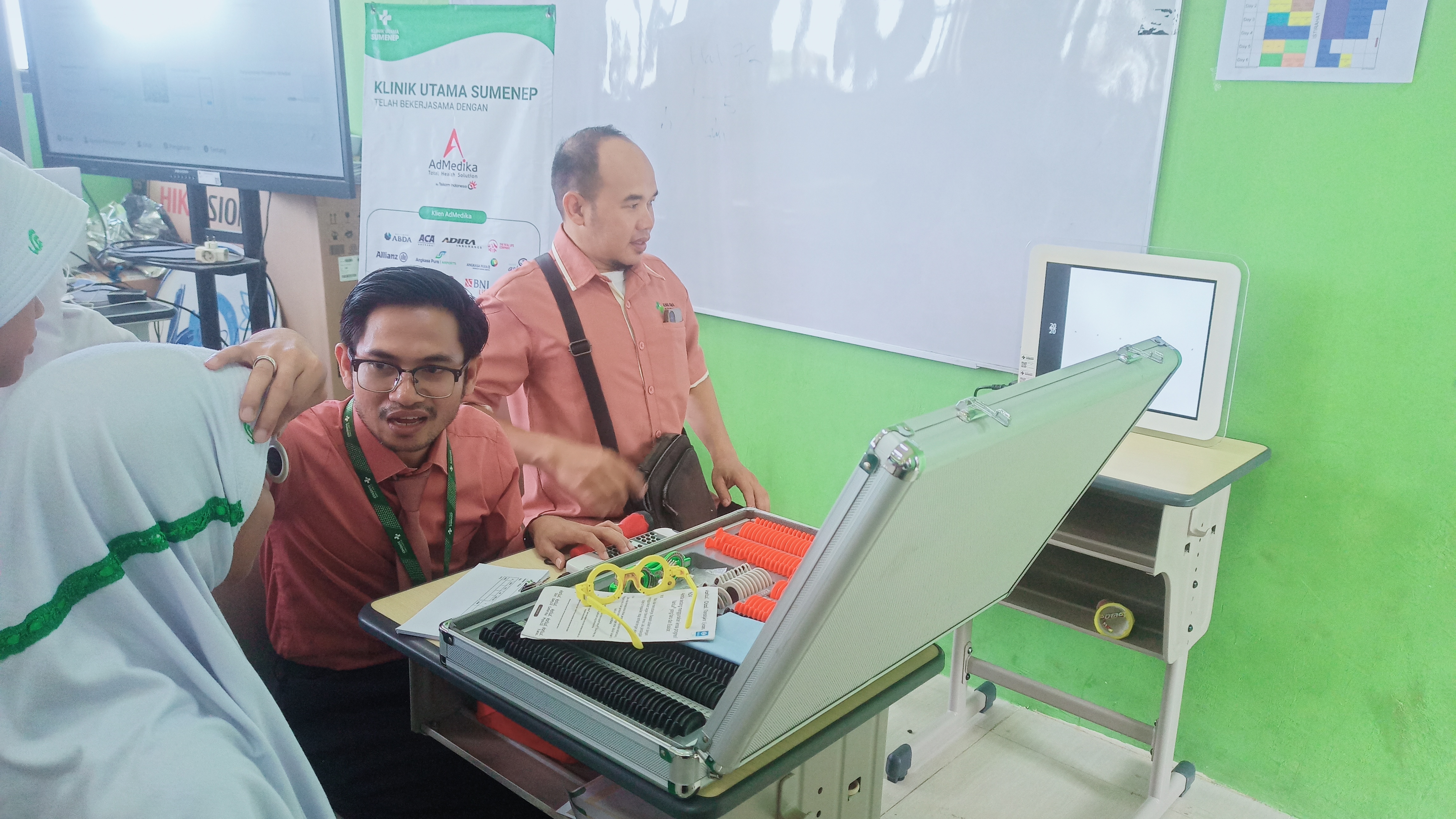 Setelah penyampaian materi, kegiatan dilanjutkan dengan pemeriksaan mata bagi siswa dan guru yang dilakukan oleh tim dari Klinik Utama Sumenep, yaitu Michael A. Batus, S.Ab., Ahmad, Amd.RO., dan Kokoh H.S. Pemeriksaan ini meliputi pengecekan ketajaman penglihatan dan deteksi dini gangguan mata.